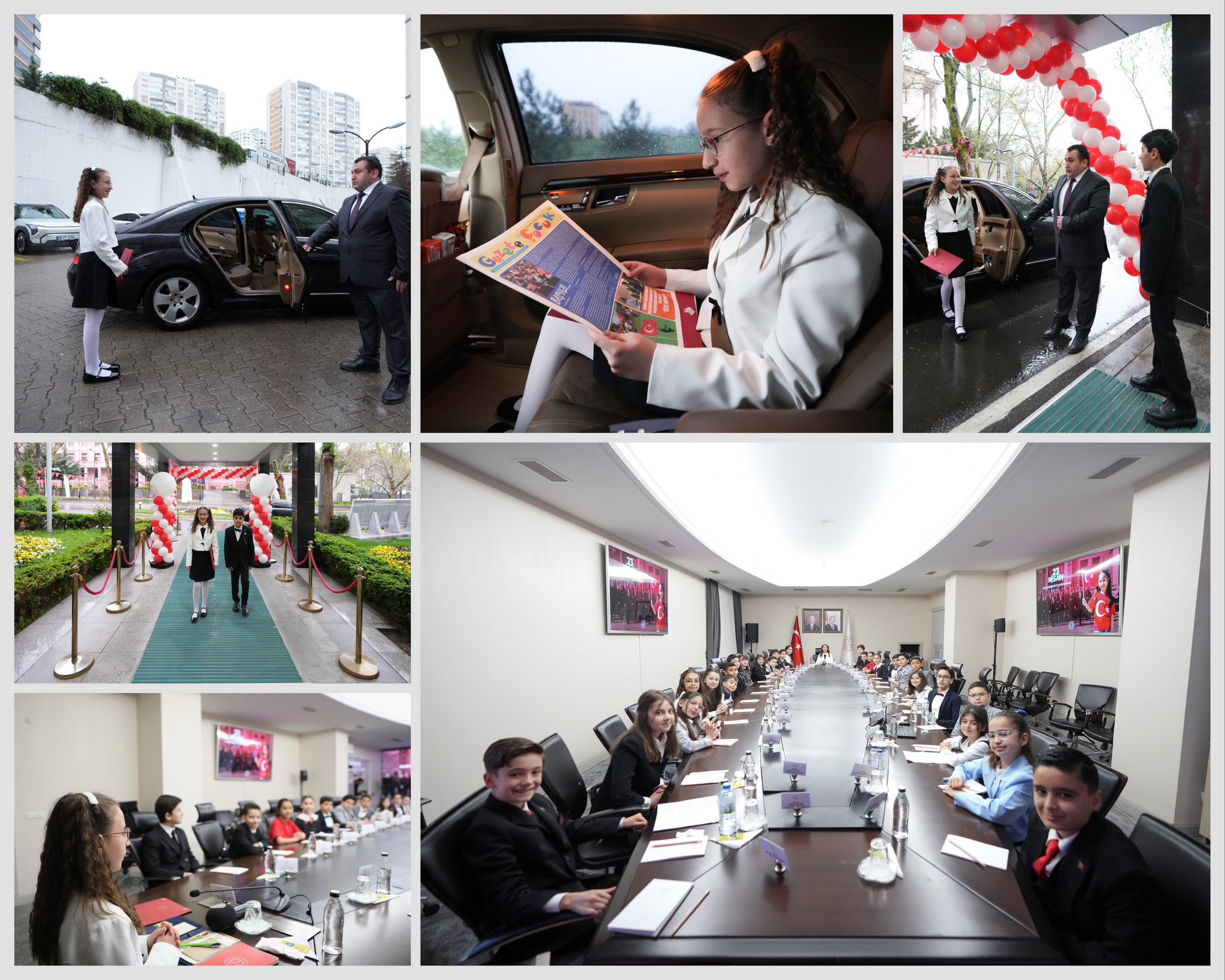Bayram dolayısıyla ay-yıldızlı balonlarla süslenen bakanlıkta öğrenciler, “Gazete Çocuk” ve Hakimiyet-i Milliye gazetesinin 23 Nisan özel nüshalarını dağıttı.